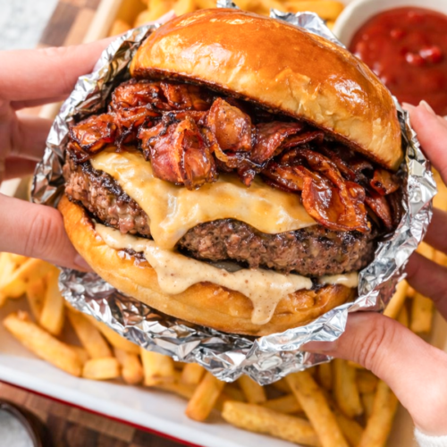 If you have been looking for a burger recipe that actually tastes like something you would order at a restaurant, this is it. A juicy beef patty, crispy bacon, melted sharp cheddar, sweet stout-simmered onions, and creamy Dijon sauce, all stacked on a buttery toasted brioche bun. It takes just under 35 minutes start to finish and uses straightforward ingredients, so it’s easily doable for a weeknight dinner.